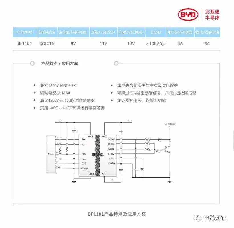 来自电动知家消息,12月14日,比亚迪半导体在先前研发成果的基础上,成功自主研制并量产1200V功率器件驱动芯片BF1181,今年12月大规模生产并向各大厂商供货。